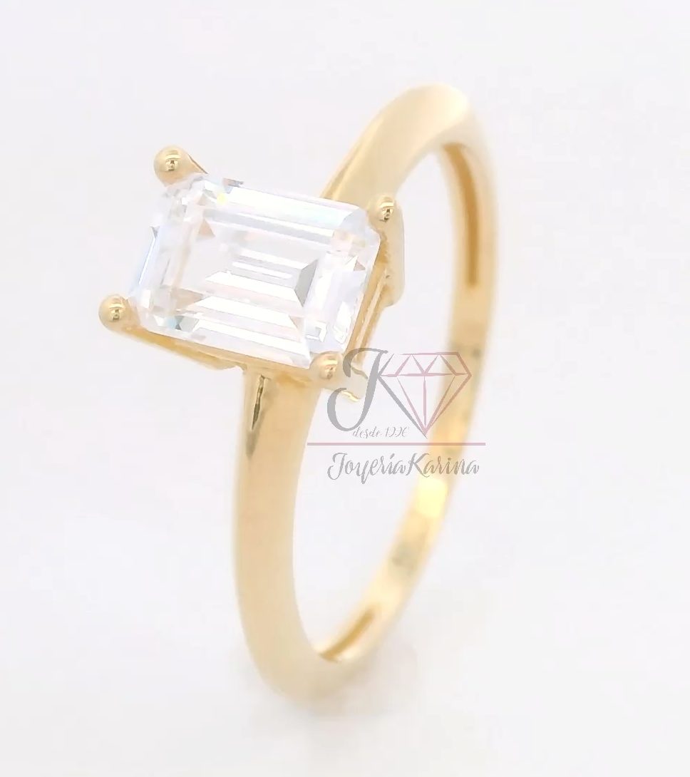 Este anillo de compromiso en oro amarillo de 10k deslumbra con su diseño minimalista y sofisticado. La zirconia central, en elegante corte esmeralda, se presenta como el punto focal de esta joya: una forma rectangular con bordes pulidos que proyecta un brillo sutil, limpio y moderno. Su engaste elevado de cuatro garras permite que la luz resalte cada faceta, mientras que el aro liso mantiene una estética refinada y contemporánea. Una pieza perfecta para quienes buscan elegancia atemporal con un toque de modernidad.