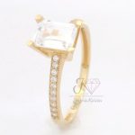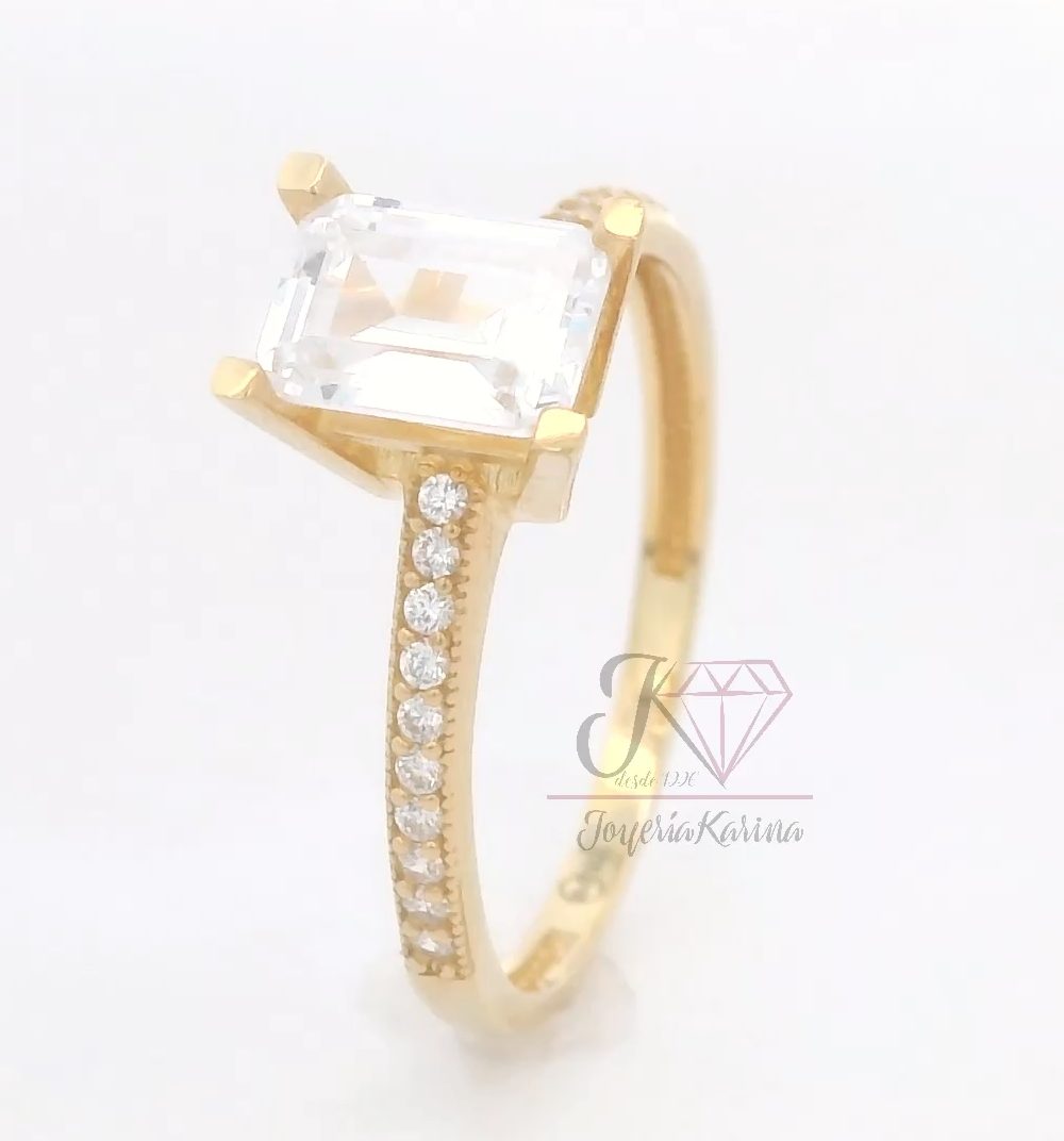 Elegancia y modernidad se fusionan en este anillo de compromiso en oro amarillo de 10k, diseñado para robarse todas las miradas. Su protagonista es una deslumbrante zirconia corte esmeralda, montada en cuatro garras que realzan su brillo desde todos los ángulos. El brazo del anillo está finamente adornado con zirconias blancas, añadiendo un toque de sofisticación y luz a cada movimiento. Es la elección perfecta para quien busca una joya clásica con un toque contemporáneo, ideal para sellar un amor eterno con estilo y distinción.