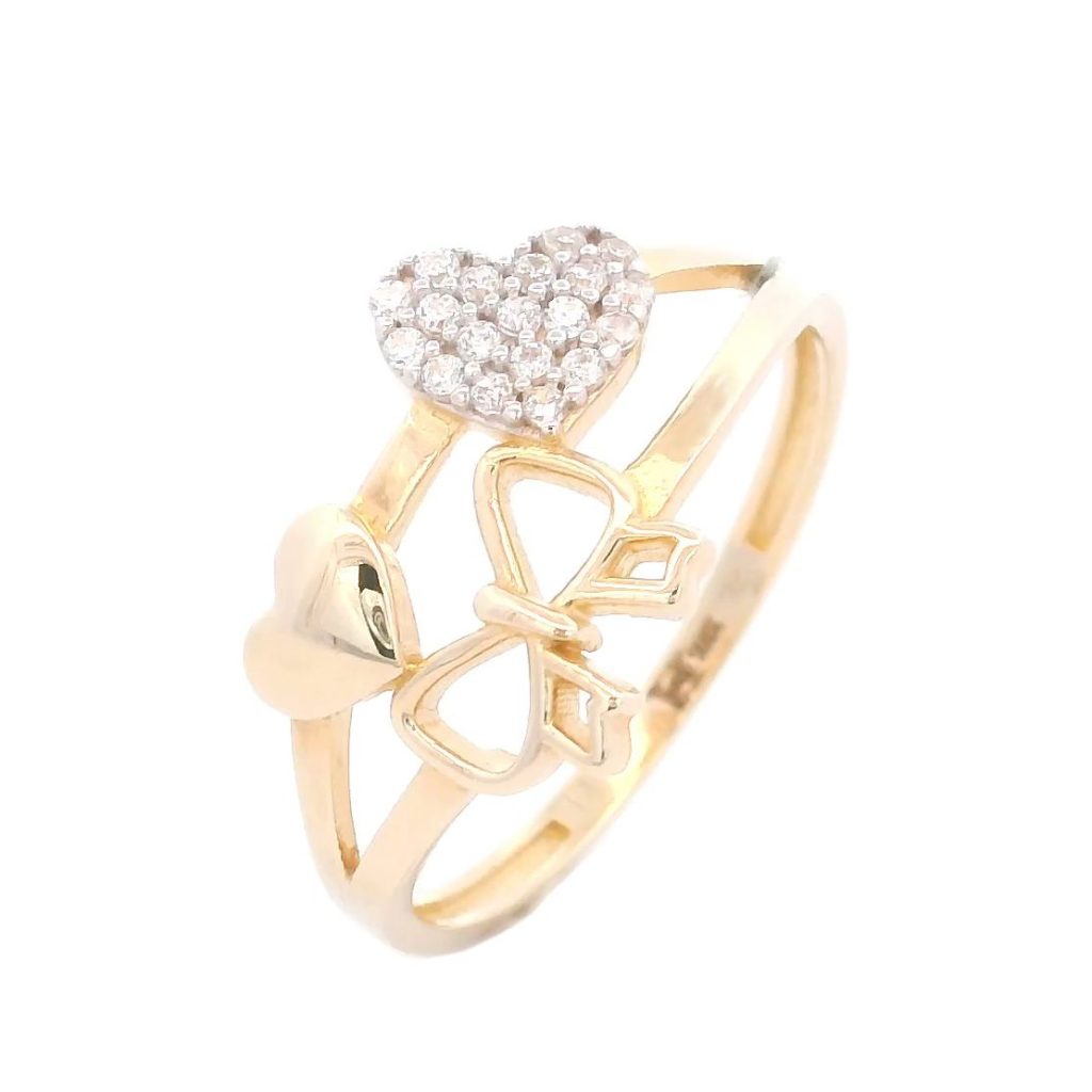 Anillo de oro 10k con un diseño encantador de corazones y lazo. La banda delgada y pulida presenta un corazón adornado con brillantes zirconias y otro corazón liso, acompañados por un delicado lazo. Esta pieza es perfecta para ocasiones especiales, simbolizando amor y elegancia con un toque moderno y sofisticado. Ideal para regalar en aniversarios, cumpleaños o como un detalle significativo para alguien especial.